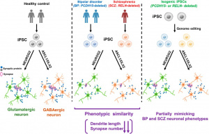 Figure 1: This diagram shows how stem cells were reprogramed into induced pluripotent stem cells (iPSCs), which act like early NSCs and can develop into many types of brain cells. These iPSCs are then directed to become glutamatergic neurons and GABAergic neurons. Neurons derived from schizophrenia patients, with a RELN deletion, showed neuron abnormalities, indicating poor neuronal connectivity. To confirm that these changes are genetic, researchers deleted the same genes in healthy stem cells, which partially reproduced the same neuronal defects. This shows how genetic factors effect neural development and synaptic structure in schizophrenia (3).