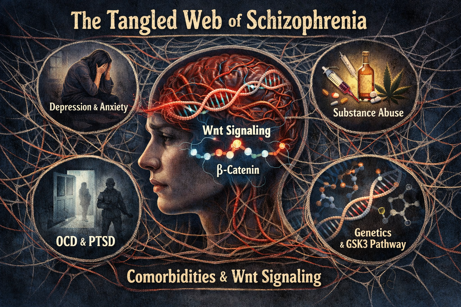 The high rates of depression, anxiety, OCD, and substance use disorders seen alongside schizophrenia may not be coincidental — they may reflect a shared underlying disruption in Wnt/GSK3 signaling that plays out differently across neural systems. Because this pathway touches so many aspects of brain development and function, a single disruption early on could leave multiple systems vulnerable in ways that manifest as distinct but co-occurring disorders. This doesn’t solve the comorbidity problem, but it suggests these conditions may share a common biological origin rather than simply co-occurring by chance.