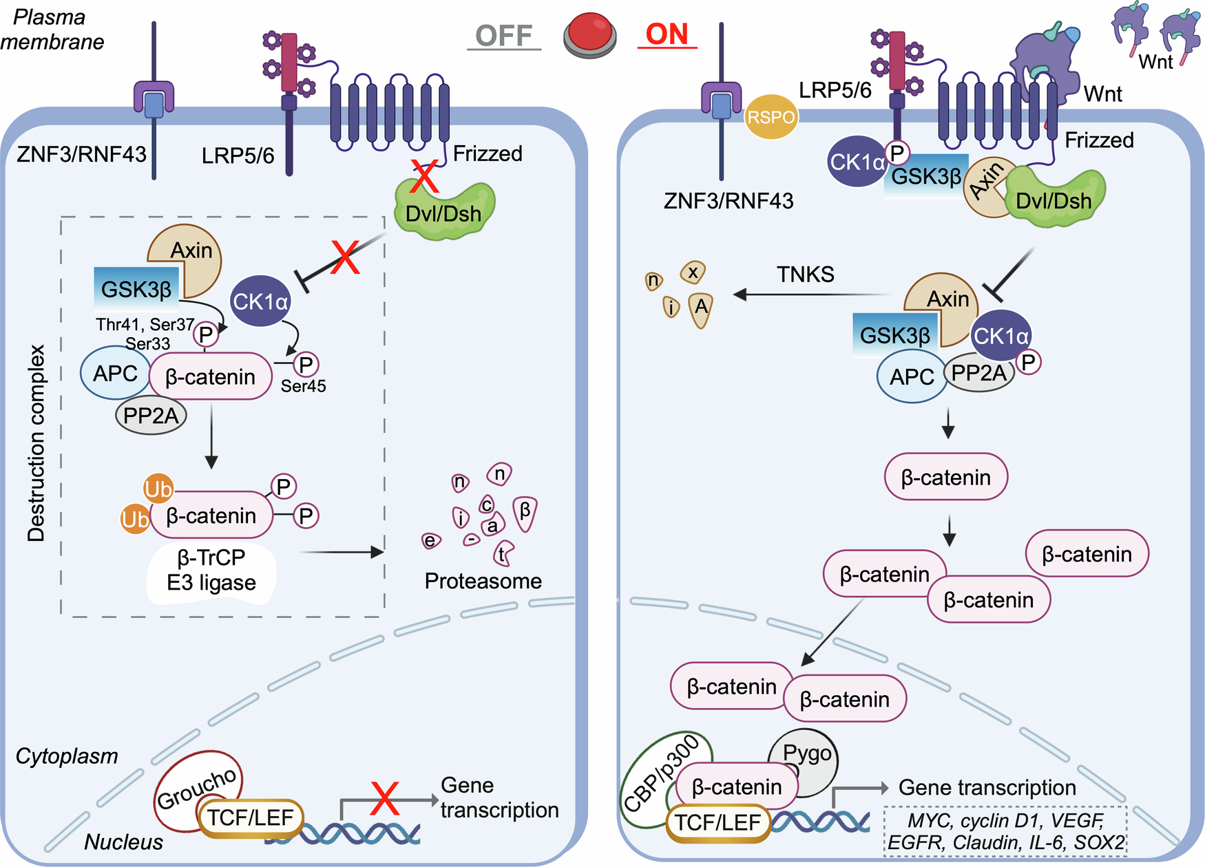 This is where emerging molecular research becomes relevant not as a solution, but as a framework for asking better questions. A 2013 review by Karun Singh in Clinical Genetics synthesized converging evidence implicating Wnt and glycogen synthase kinase 3 (GSK3) signaling in the biological basis of schizophrenia.3 The canonical Wnt pathway regulates β-catenin stability and downstream gene transcription, and plays a prominent role in neural development. The pathway depends on the stability of β-catenin: whether it gets broken down or or survives long enough to enter the nucleus. GSK3β is the key enzyme that drives that breakdown, so when Wnt signaling is active, or when GSK3β is blocked, β-catenin accumulates and gene transcription follows. This is illustrated clearly in Figure 1, where Wnt signaling being turned off results in the destruction of β-catenin, and Wnt being turned on results in the surplus of β-catenin which enters the nucleus.4 When disrupted, the consequences affect the very systems implicated in psychiatric vulnerability.