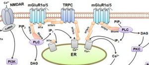 Figure 1: Long-form Homer proteins (peach rectangles, “H1b/c”) stabilize mGluR signaling by linking receptors to intracellular calcium pathways, while short-form Homer proteins (peach circles, “H1a”) disrupt this scaffolding, altering signaling and promoting synaptic changes [5].