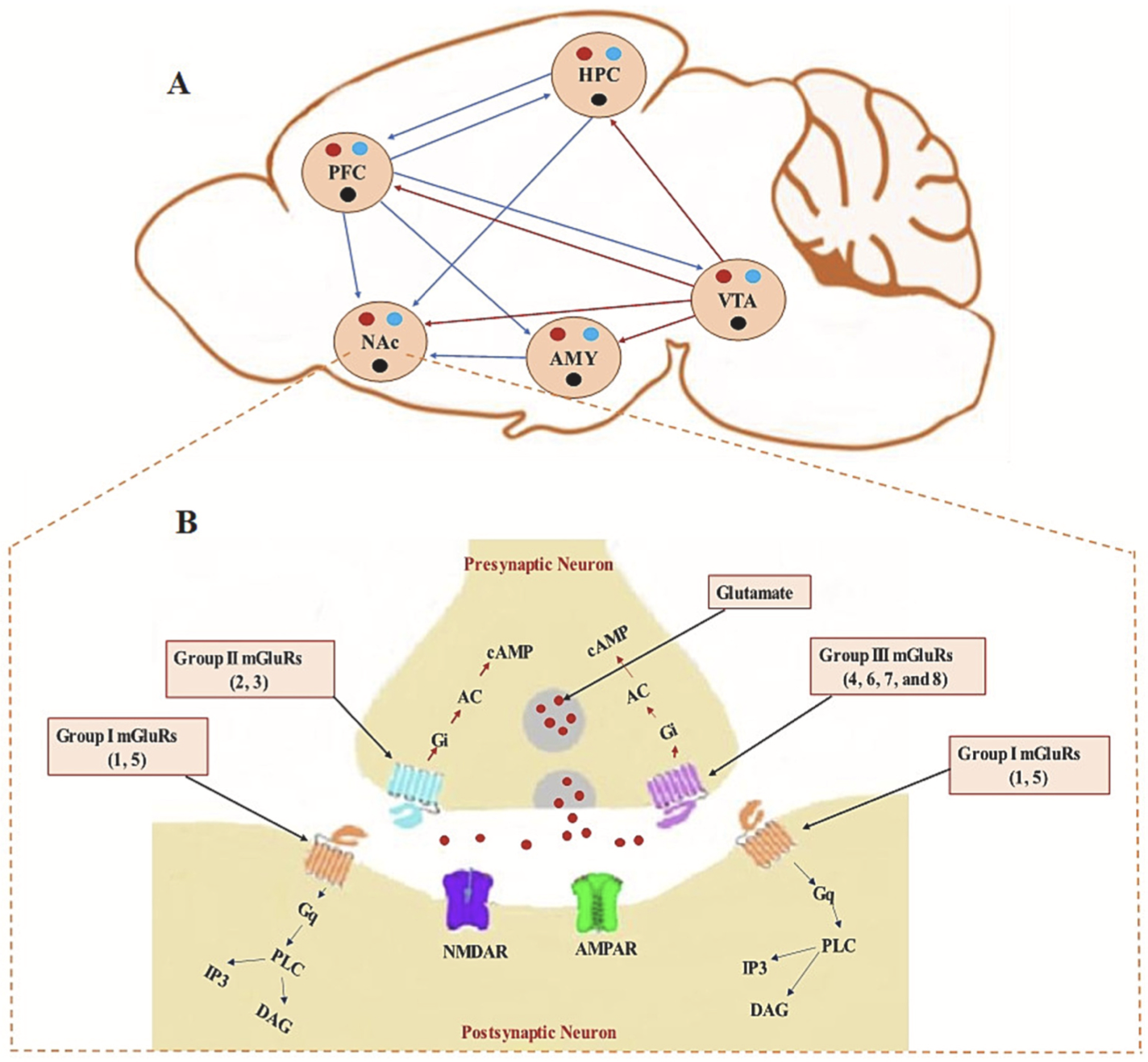 Most public conversation about addiction focuses on dopamine, but glutamate (the brain’s primary excitatory neurotransmitter) is equally central to why addiction is so hard to escape. Glutamatergic circuits connect the prefrontal cortex, the nucleus accumbens (NAc), the amygdala, and the ventral tegmental area: the core of the brain’s reward system. The mGluRs that sit throughout this circuit act as volume knobs, tuning the strength of signals flowing between these regions.