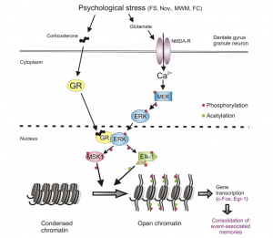 Figure 1(right): An image of how stress activates both glucocorticoid receptors and neural signaling pathways to drive gene expression and memory formation. [1]
