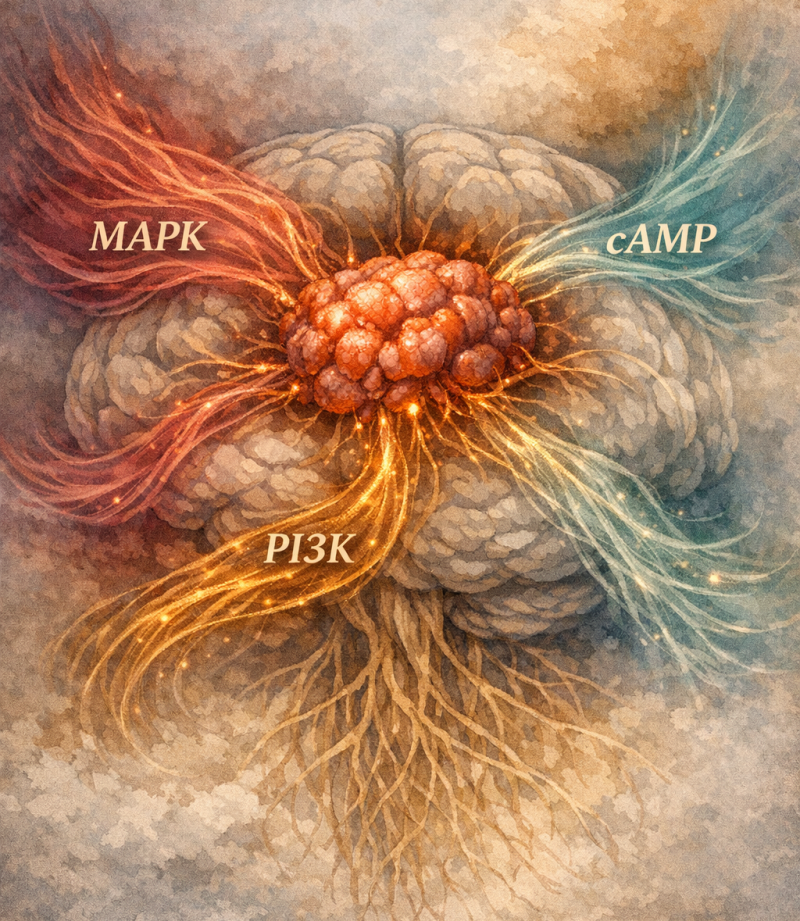 On a deeper level, GBM is driven by complex communication systems inside cells known as signaling pathways. Three major ones, PI3K, MAPK, and cAMP, control how cells grow, survive, and spread. In glioblastoma, these pathways are often overactive or disrupted, pushing cells to divide uncontrollably and resist death . Even more challenging, these pathways don’t act alone, they interact and “talk” to each other, creating backup systems that help the tumor survive even when one pathway is targeted. Because of this, researchers now believe that treating GBM effectively will require targeting multiple pathways at once—or finding ways to interrupt key “hubs” where these signals converge [1].